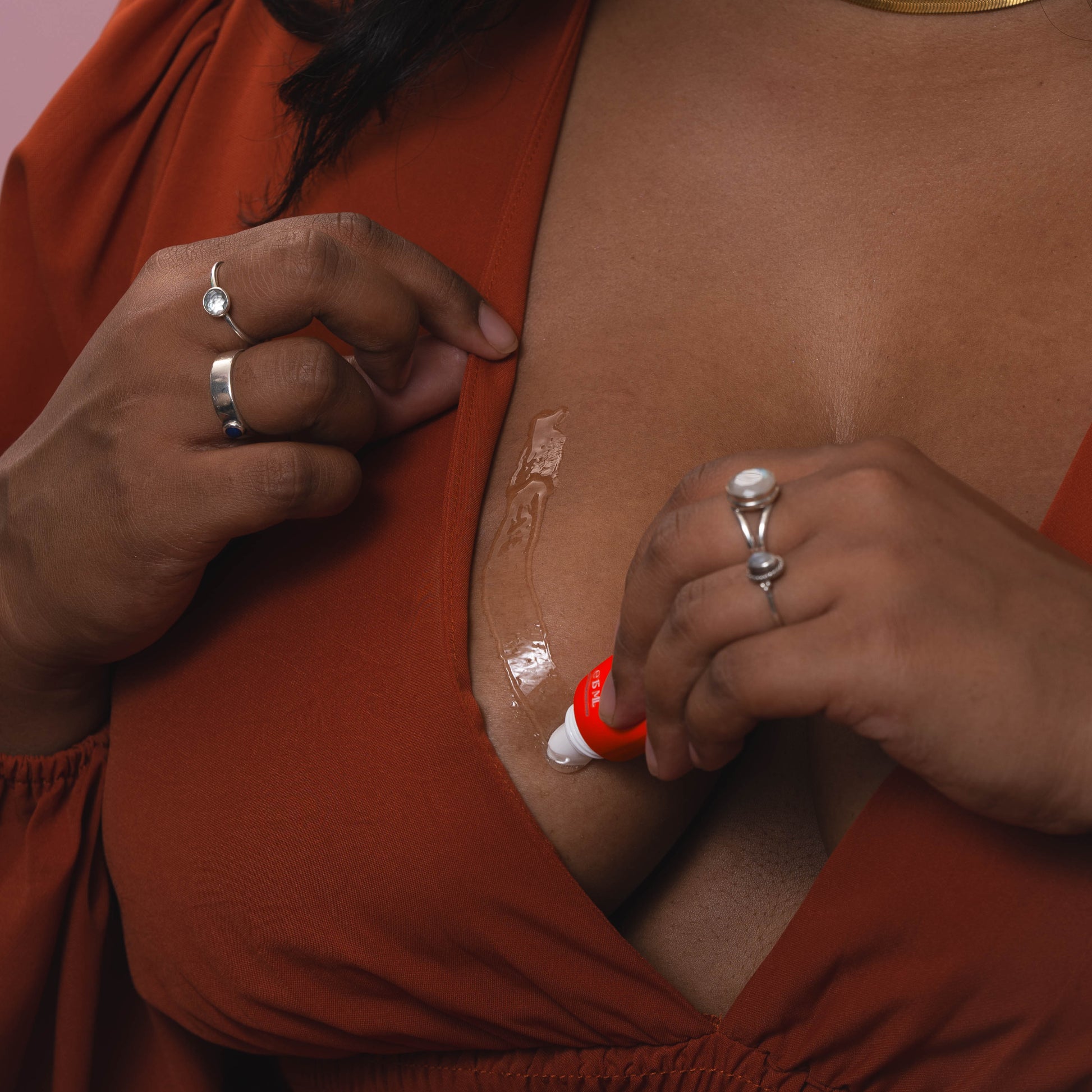 For your thinner fabrics like silk and lace, apreading CLUTCH nice and thin and letting it get tacky ensures it won't seep through the fabric. If you find it doesn't feel secure enough, apply CLUTCH thinly but over a larger surface area of skin.