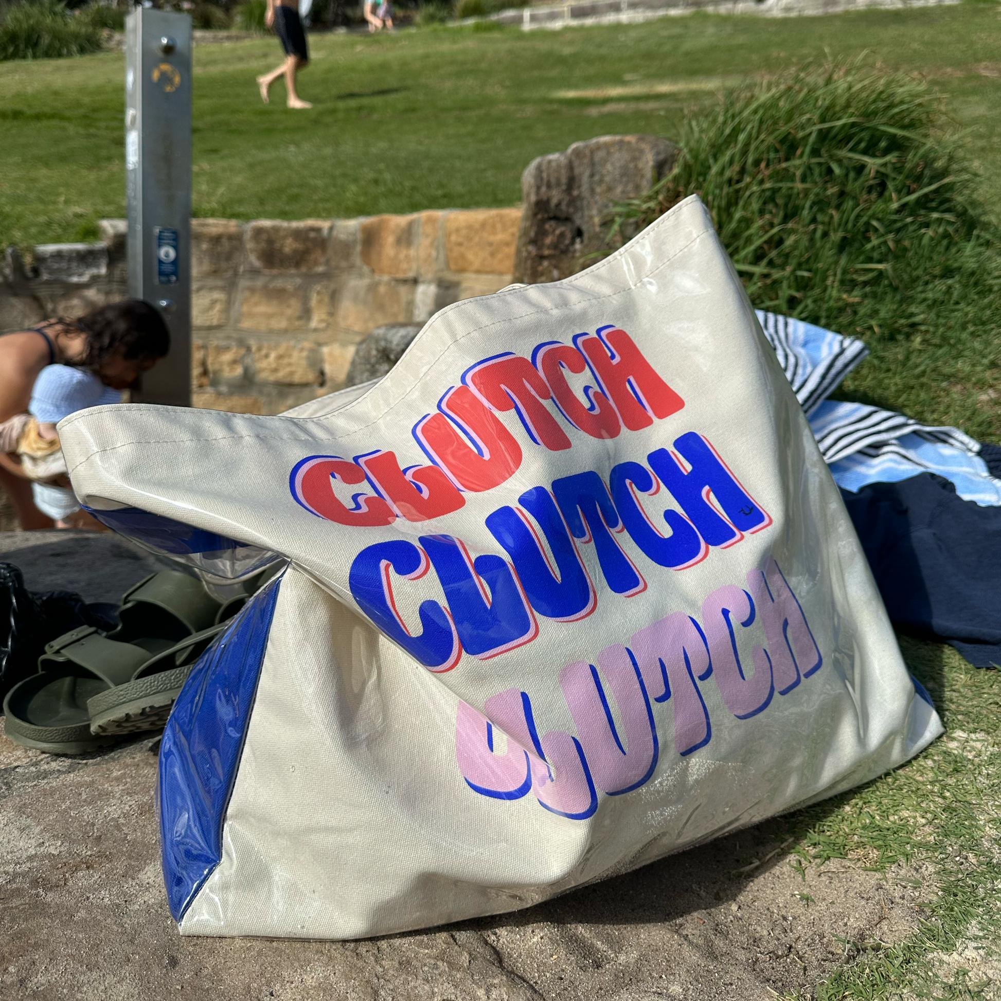 Looking for a ludicrously capacious bag to lug all your stuff to the beach this summer? This gargantuan tote (50x40x16cm) will fit your towel, emotional support water bottle and everything else you need for a perfect day out. This canvas tote has a plastic exterior to keep all of your stuff dry and features a 3 CLUTCH logo pattern on both sides.
